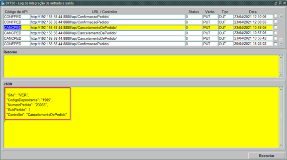 Acessando a SY700 e pesquisando por CANCPED, no quadro JSON temos os valores referente a transação.