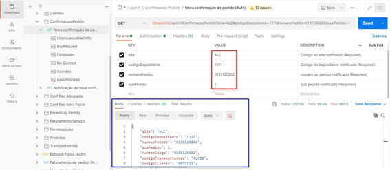 Agora acesse o Postman, na API Confirmação Pedido GET acesse a aba “Params” e no quadro “Query Params” deve-se preencher os valores solicitados.