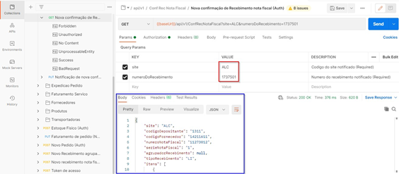 Agora acesse o Postman, na API Conf Rec Nota Fiscal GET acesse a aba “Params” e no quadro “Query Params” deve-se preencher os valores solicitados.