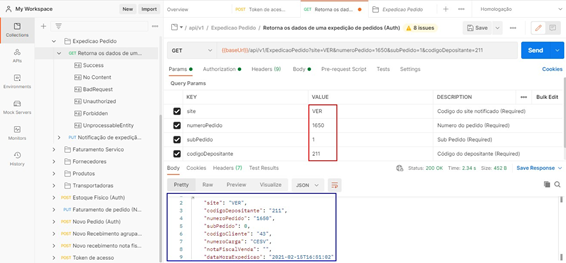 Agora acesse o Postman, na API Expedição Pedido GET acesse a aba “Params” e no quadro “Query Params” deve-se preencher os valores solicitados.
