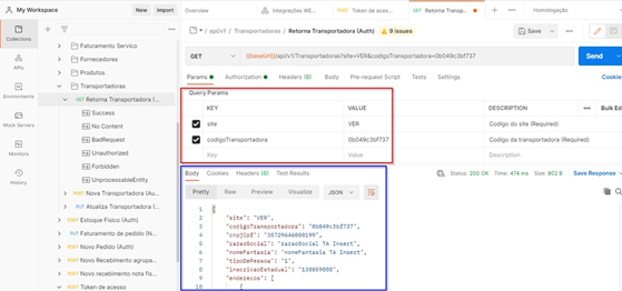 Agora acesse o Postman, na API Transportadoras GET acesse a aba “Params” e no quadro “Query Params” deve-se preencher os valores solicitados.