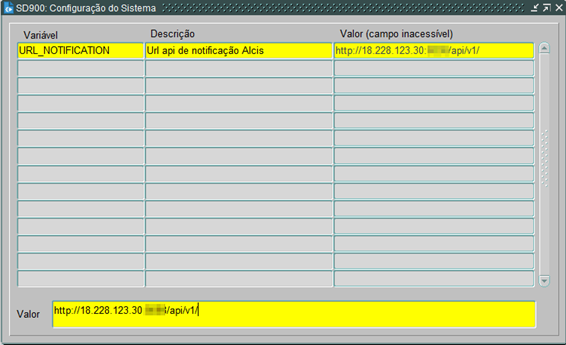 A tela SD900, é de configuração do sistema. Nesta tela será indicado o endereço base da API de notificação Alcis. Para isso, basta informar no campo valor.