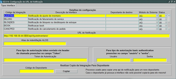 A tela SD314, é responsável pela configuração do Endpoint da API do cliente que receberá a notificação de saída do WMS Full. Nesta tela é possível ativar e desativar notificações, basta alterar para status 90.