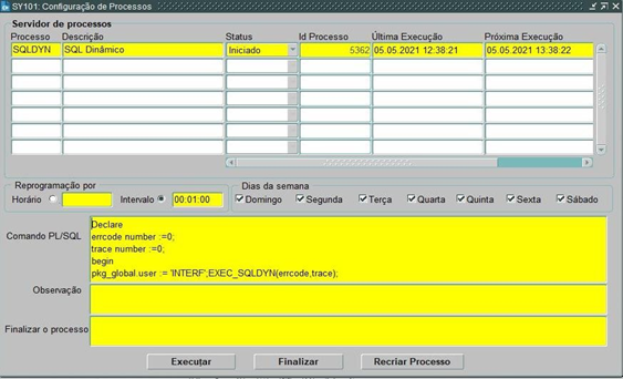 A tela SY101, é de configuração de Jobs usados no WMS. Nesta tela será iniciado o job chamado SQLDYN caso o mesmo esteja com status “Parado”. Esse job tem a função de realizar a chamada no notificador Alcis para notificação das integrações de saída para o sistema parceiro. As notificações são disparadas na dependência desse serviço.