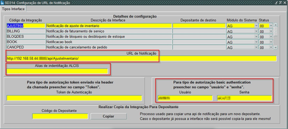 Cada linha representa uma integração diferente. No campo “URL de notificação” deve ser informado o endereço da API do cliente que irá receber a notificação de integração de saída. Caso a mesma tenha algum token de autenticação, deve ser informado no campo “Token de Autenticação”. No campo “Alias” deve ser informado o alias do cliente que será fornecido pela Alcis no momento da compra do sistema.