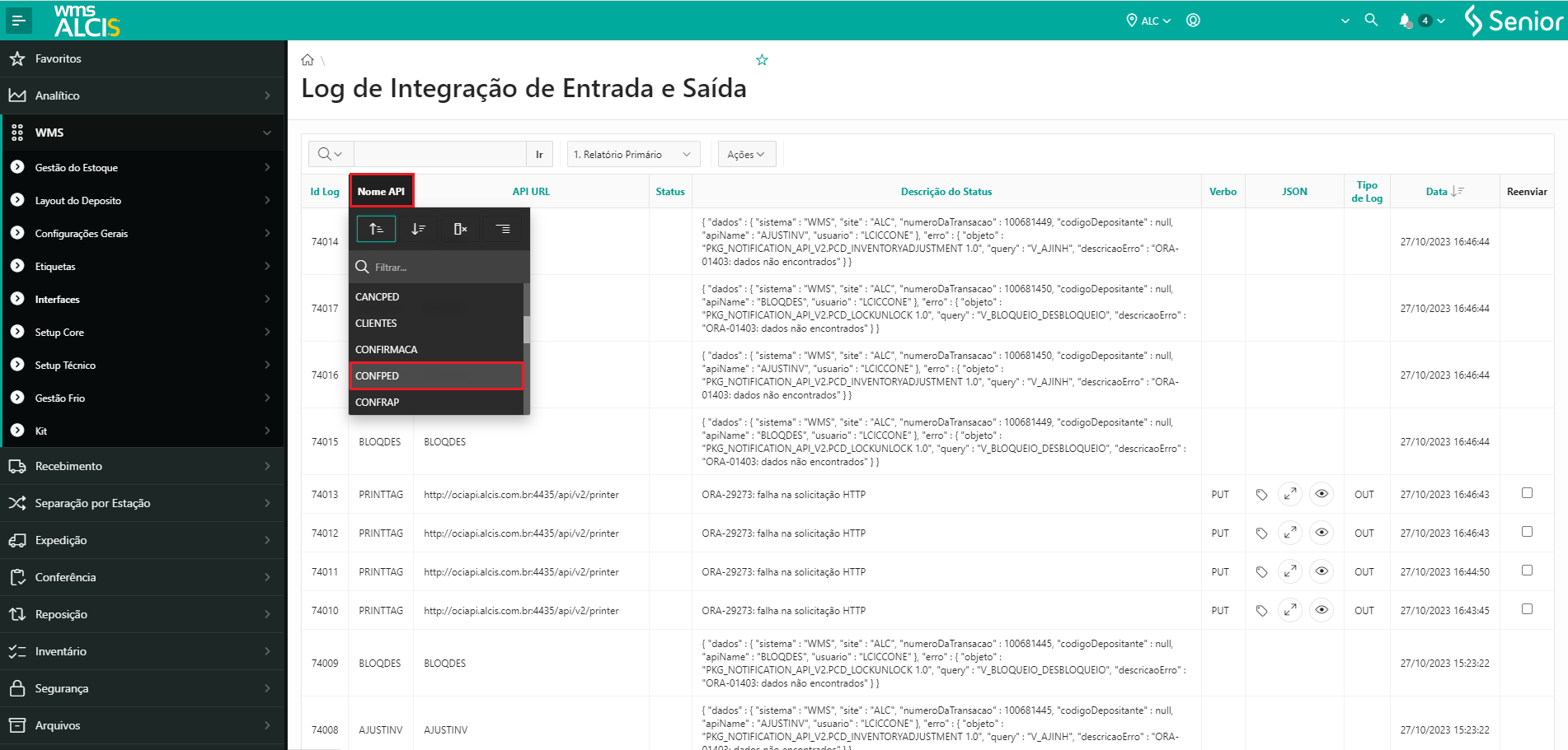 Ao acessar a tela Log de Integração Entrada e Saída (SY700), os registros de log das APIs serão exibidos. Para consultar uma API específica, basta utilizar o campo da tabela e opção desejada. Por exemplo, para a API CONFPED, no campo Código da API e selecionar a opção CONFPED, irão aparecer somente os logs dessa API.
