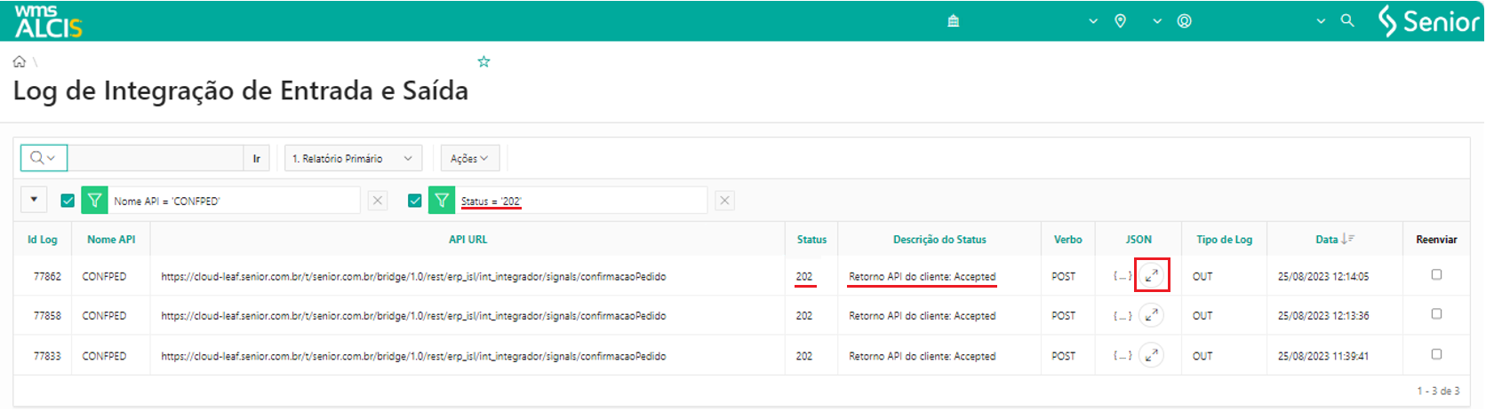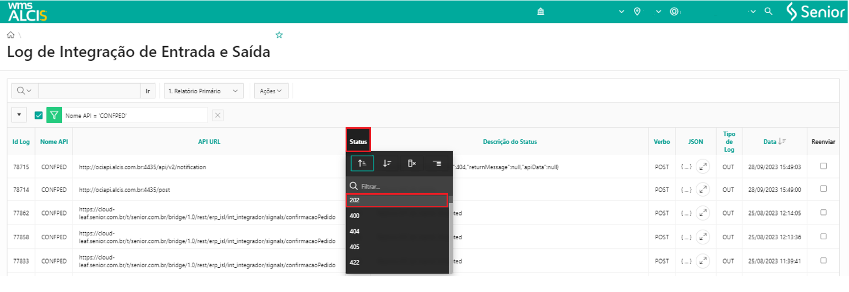 Após selecionar a API desejada, é possível refinar a busca adicionando filtros. No exemplo, adicionamos o filtro na coluna Status a opção 202 – Retorno API do cliente: Accepted, para visualizar apenas as APIs CONFPED com esse status. Para visualizar os dados enviados na API selecionada basta expandir o campo JSON clicando no ícone . Isso permitirá a visualização detalhada dos dados da API.