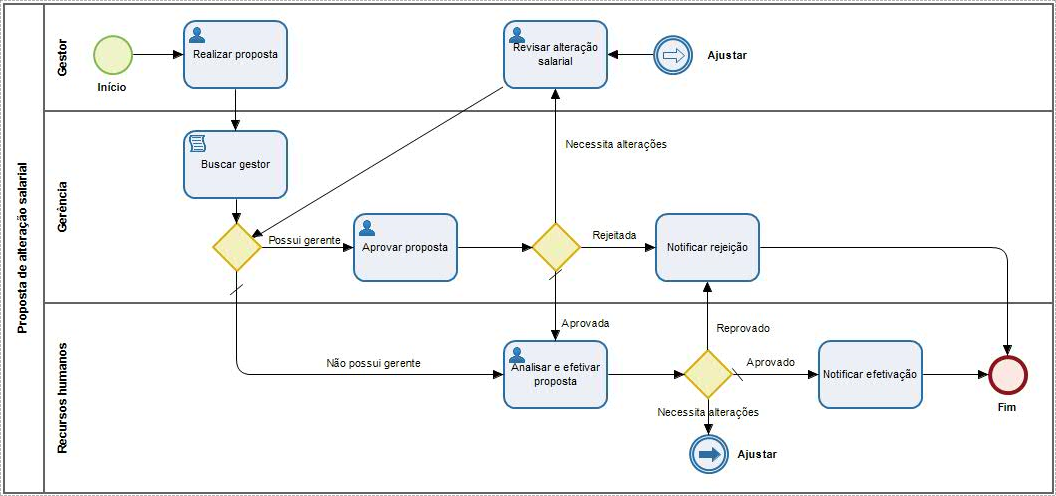 Ao realizar uma proposta de alteração salarial, o pedido é enviado diretamente ao superior imediato, de acordo com a hierarquia de postos. Após sua aprovação, esta solicitação é enviada para o recursos humanos que realiza a efetivação dos dados.