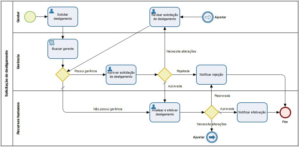 Ao realizar a solicitação de desligamento de um colaborador de sua abrangência, o pedido é enviado diretamente ao superior imediato, de acordo com a hierarquia de postos. Após sua aprovação, esta solicitação é enviada para o recursos humanos que realiza a efetivação dos dados.