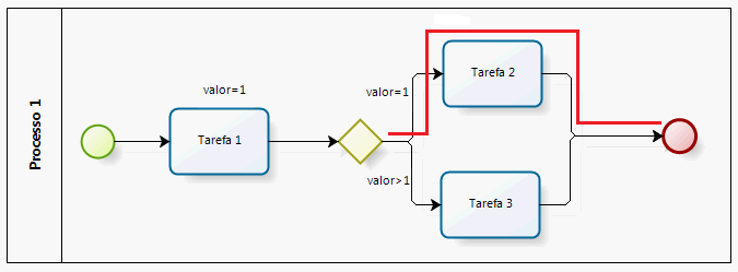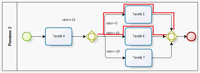 - O primeiro SequenceFlow cuja expression for verdadeira define o caminho de saída, os demais caminhos são ignorados. Caso nenhuma expressão for verdadeira e houver um SequenceFlow definido como default o fluxo segue por ele, senão, é gerado erro informando que o processo não foi definido corretamente;