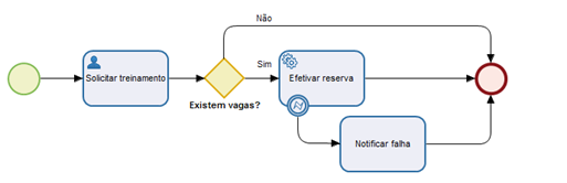 Para exemplificar o uso dessa função, será utilizado o processo abaixo, tendo como premissa que, durante a execução do processo ocorrerá um erro na execução da tarefa Efetivar reserva. Esse erro será capturado pelo evento de borda da mesma tarefa e seguirá o caminho desse evento de borda, executando na sequência a tarefa de Notificar falha, que nesse caso, é a primeira Activity do caminho de tratamento de erro, ou seja, é onde as informações do erro estarão disponíveis, sendo portanto onde a função será utilizada.