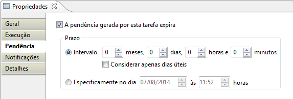 Caso a propriedade anterior seja marcada, deve-se informar o intervalo para que a pendência gerada por esta atividade expire. Nota No intervalo, considera-se por padrão o mês sendo 30 dias. |