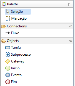 A paleta de edição disponibiliza acesso rápido aos componentes de um modelo de processo. A utilização dessa paleta torna a criação dos modelos mais ágil e intuitiva.