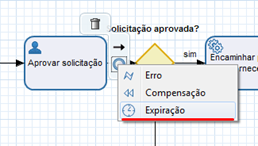 No nosso caso, nós queremos garantir que a tarefa de “Aprovar solicitação” seja tratada dentro de um determinado tempo, para isso então, adicionaremos uma expiração para nossa tarefa. Uma expiração indica que a tarefa possui um tempo limite para o seu tratamento e caso esse tempo exceda, uma ação pode ser definida no processo. Para mais detalhes sobre a expiração, consulte a documentação.