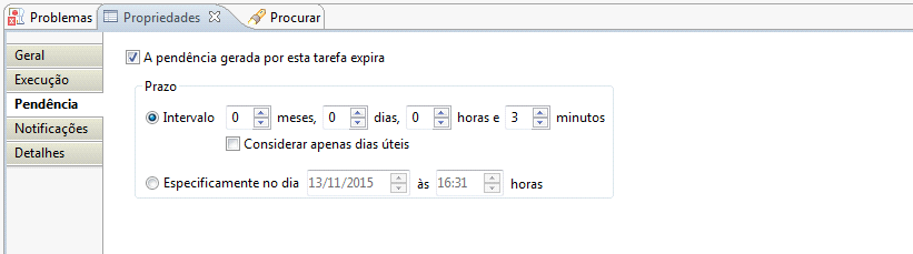 Falta definirmos em quanto tempo que a tarefa expirará. Para o nosso cenário, colocaremos que a tarefa irá expirar depois de 3 minutos para podermos testar este recurso na prática de forma mais breve. Esta configuração é feita na aba Pendência das Propriedades da tarefa.